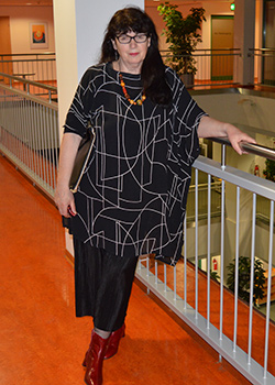 Modegrafiken schmückten die Wände und dazu die Modepuppen mit den dazu angefertigten Kleidern, mit denen Sie Preise international, den „Baltic fashion award“ erhalten hat. Darunter sogar ein Kleid aus Glas. Daneben in Vitrinen gut verstaut, eine edle Schmuckkollektion, entstanden im „Studium Designer im Handwerk“, sowie ein raffiniert gestaltetes Regal mit Leuchtpunkten.