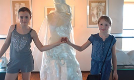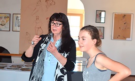 Am Donnerstag, den 18. Mai, eroberten die Mädchen der GTA Mode den Turm auf Schloss Augustusburg, immerhin 130 Stufen aufwärts. Was Sie dort vorfanden, war eine gelungene Überraschung. Christine Werzner stellt seit dem 6. Mai 2017 ihre „SchokoladenSeiten“ aus. Es ist ein Querschnitt Ihres Schaffens. Skulpturen aus Bronze, 70 cm groß, „Die Tänzerin“, entstanden nach Studien im Ballettsaal des Opernhauses Chemnitz. Übergroße farbige Masken aus Ton, Papier und Gips, für das Theaterstück „Der Gin aus der Flasche“ in Zusammenarbeit mit dem Italiener, Georgio Furlan vom Rittergut Ehrenberg. Aktzeichnungen, entstanden im Zeichensaal der Hochschule Zwickau, Fachbereich Angewandte Kunst, hingen als großes Vlies von der Decke herab.