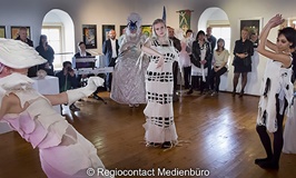 Eine Ausstellungseröffnung ist für Christine Werzner immer auch ein künstlerischer Akt. "Für mich gehört eine Performance einfach dazu. Kleider müssen präsentiert werden", sagt die Künstlerin, die seit dem Wochenende in der Turmgalerie in Augustusburg ausstellt. "Schokoladenseiten - Menschen, Bilder in Kunst und Mode" heißt die Ausstellung, in der Werzner neben ihren teils preisgekrönten Kleidern auch Bilder, darunter zahlreiche Aquarelle, und Plastiken ausstellt. Zur Ausstellungseröffnung am Samstag gab es vor etwa 70 Zuschauern eine besondere Modenschau. So präsentierten unter anderem Josi Arnold und Björn Einert (im Bild) die ausgefallenen Kleider der Künstlerin. Die zwei jungen Leute - er ist Student in Dresden, sie Schülerin in Zschopau - erzählten in den dazu passenden Kleidungsstücken die Geschichte einer schwebenden Blume, die auf einer Wiese von einer mystischen Figur verfolgt wird. Die Ausstellung in der Turmgalerie ist noch bis zum 4.Juni zu sehen.