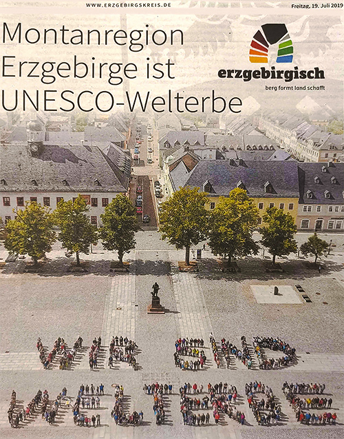 Einen Tag danach wurde auf dem Marktplatz von Marienberg der Schriftzug "Wir sind Welterbe" gebildet. Sachsen und Böhmen verbindet jetzt ein Welterbe, das sich aus 22 Bestandteilen zusammensetzt - 17 Bestandteile auf deutscher und 5 auf tschechischer Seite. Nur in der Verbindung aller Bestandteile liegt der außergewöhnliche universelle Wert begründet.
